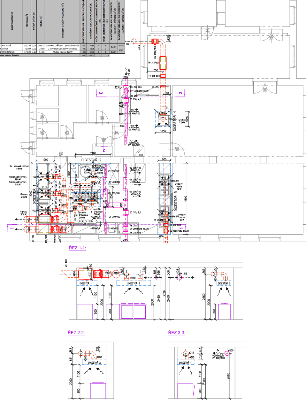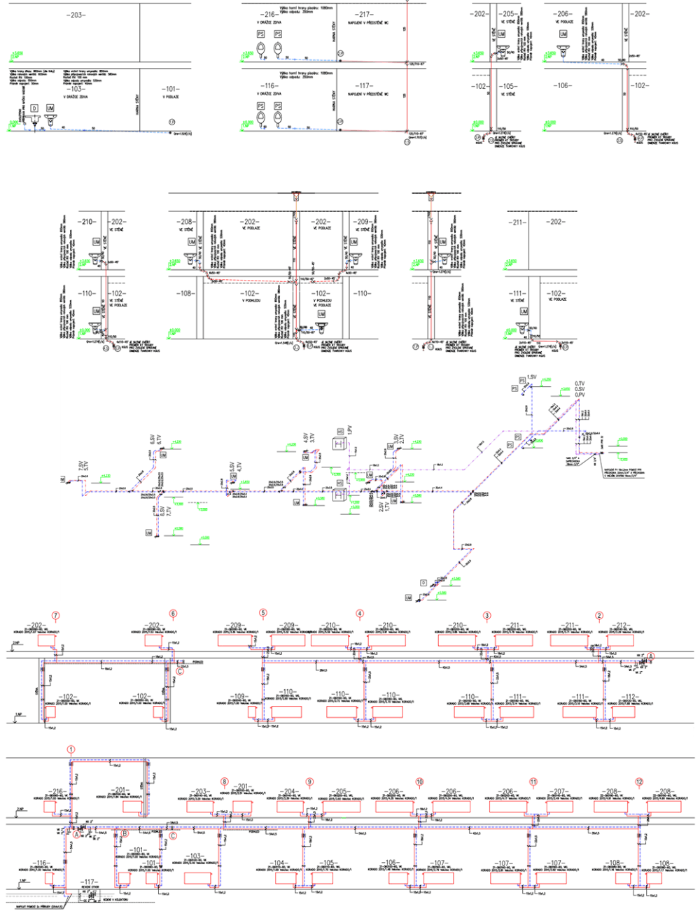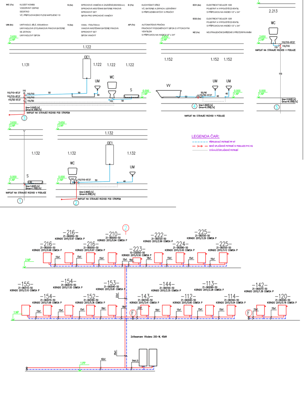 Komplexní návrh ústředního vytápění, chlazení a vnitřních zdravotechnických rozvodů nově rekonastruovaného pavilonu školy.