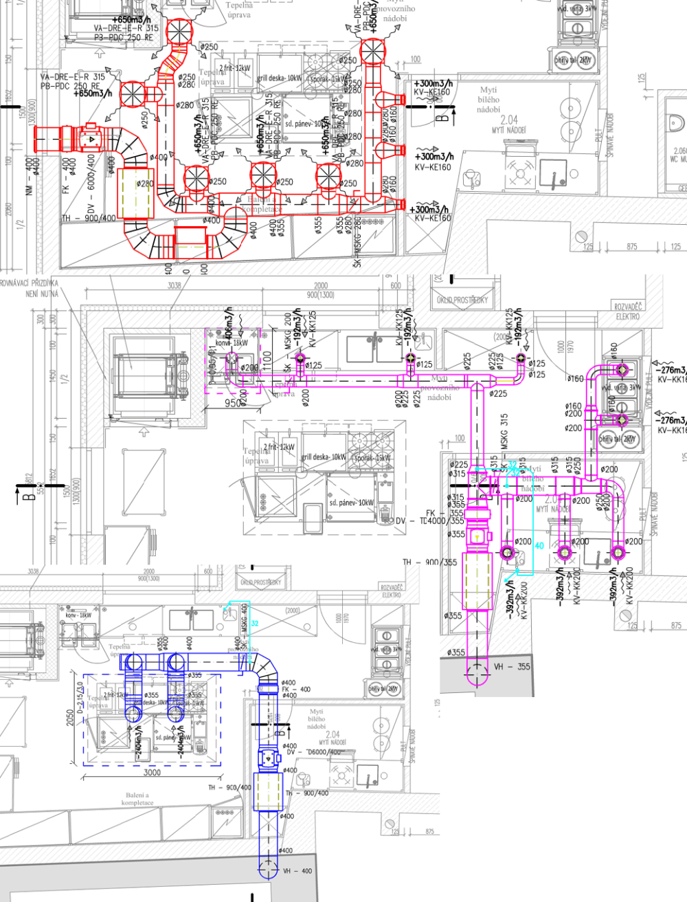 Nucené větrání modernizovaného kuchyňského provozu stávající jídelny základní školy.